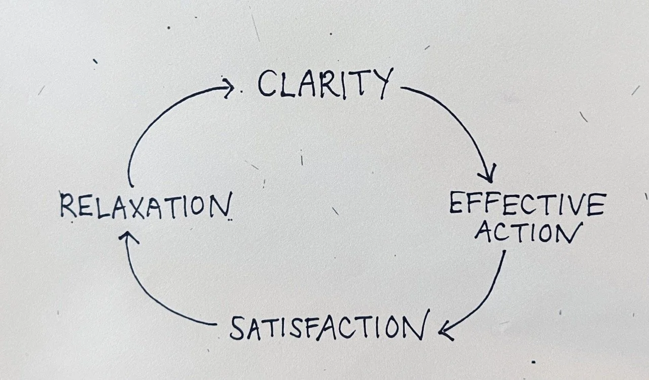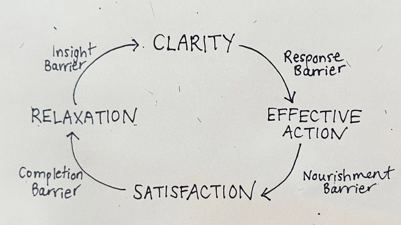 When we are functioning well, the cycle begins in relaxation, which is the open state of mindful awareness that is not trapped in patterns, habits, and defenses. As you relax, you take in the whole picture and find clarity about action possibilities and learning curves. Effective action happens when we use the insight and mobilize energy toward a particular action.